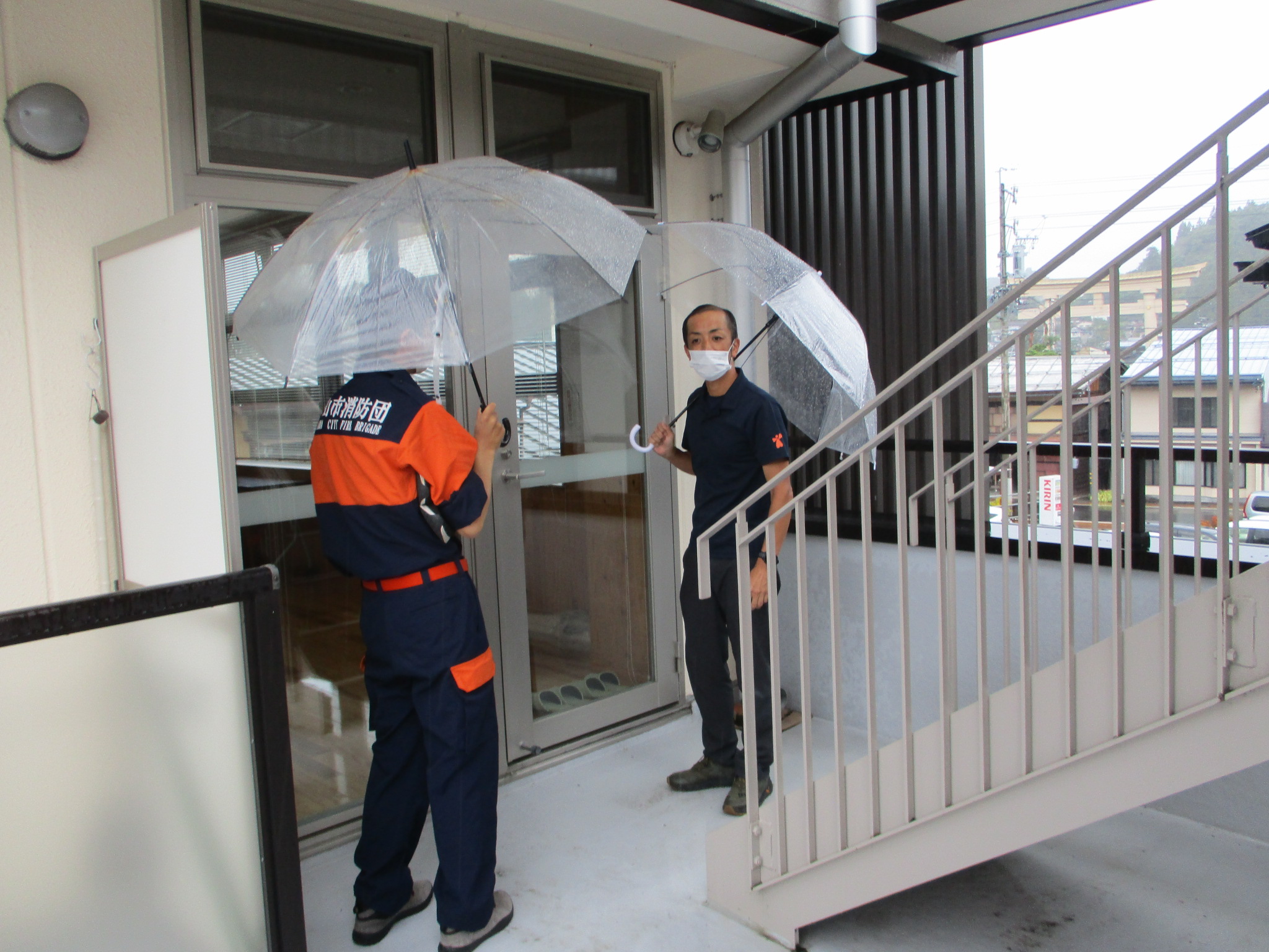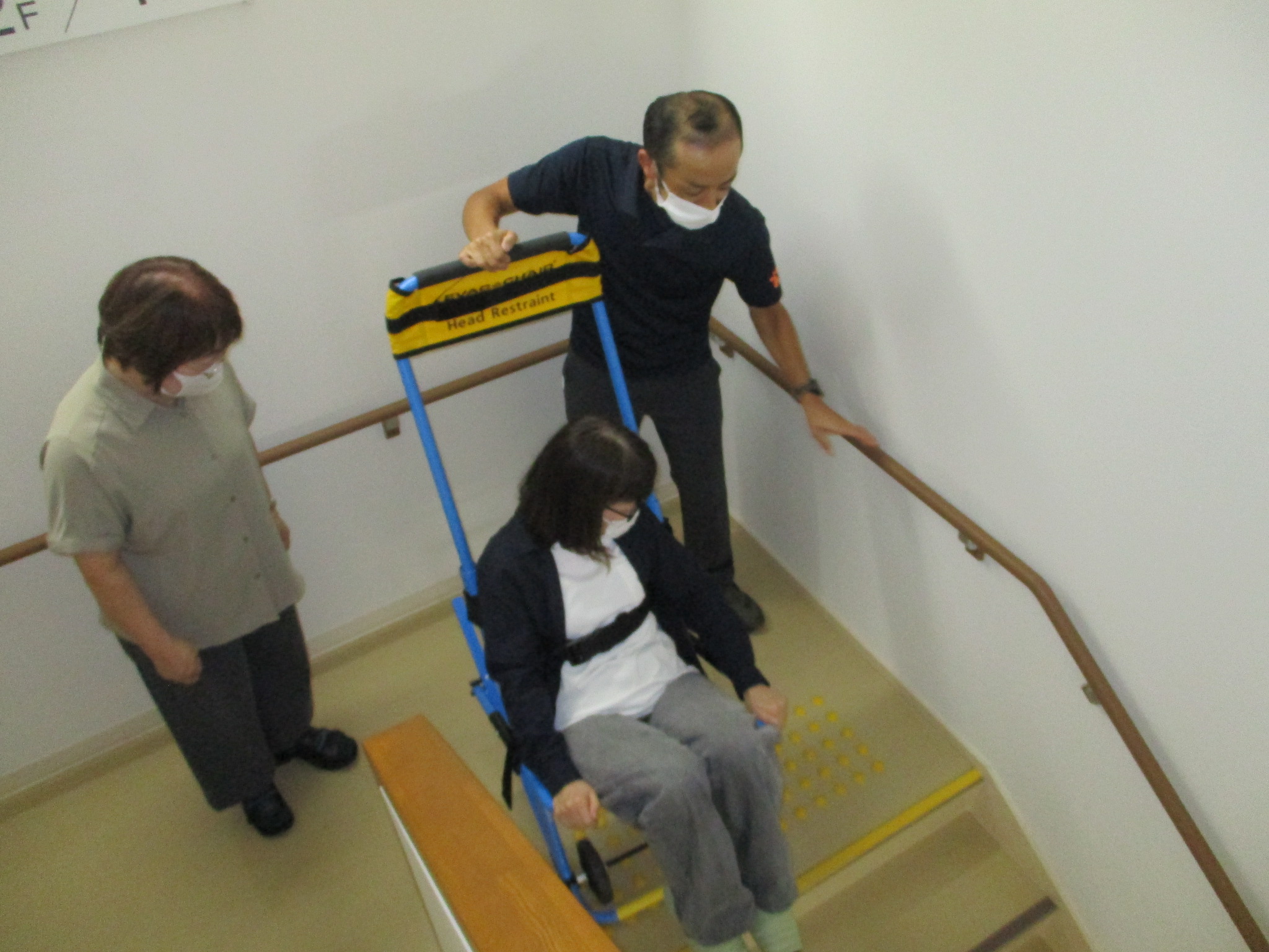総合防災訓練(R7.10) 2025/10/22 入居者はじめ地元消防団の方、近隣住民、町内の方にも参加していただき、総合防災訓練を行いました。避難路の確認、器具を使用した避難方法及び消火器や自家発電機操作確認と体験もしてもらいました。初めて経験される方もみえましたが、訓練の重要性も理解してもらいながら、定期的に実施していきます。