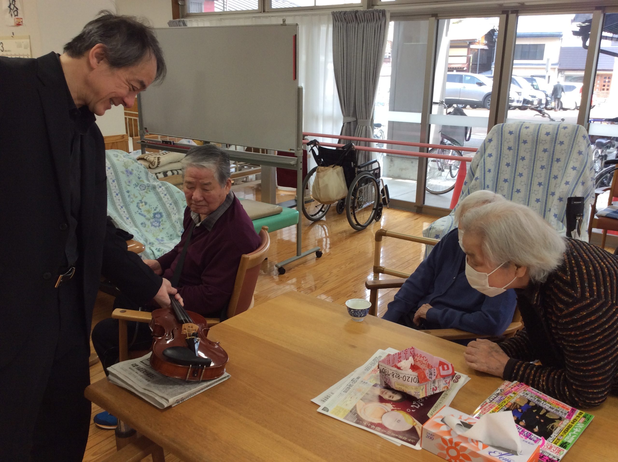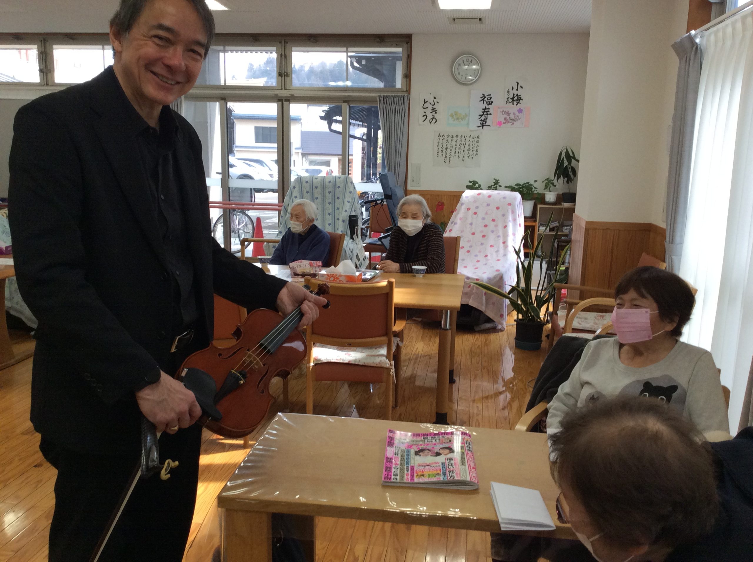 初めての開催になりますが、高山市文化協会様のご厚意にて飛騨春慶弦楽器での演奏会を開催していただきました。オーケストラアンサンブル金沢所属トロイ・グーギンズさん他1名の方による、素晴らしいクラシックを中心とした演奏会でしたが、馴染みの深い曲目の演奏やトロイ・グーギンズさんの軽妙なトークで、笑いもありとてもクラシックを身近に感じる事もできました。中々、プロの演奏を聴く機会もなくデイ利用者・入居者はじめスタッフも有意義な時間を過ごす事ができました。ありがとうございました。